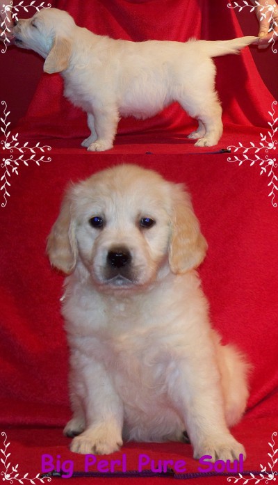 Perlička byla klidnější štěndo, ale nyní je to docela uličnice. První zdolala okraj porodní bedny a zvesela prozkoumává celý byt. Narodila se jako šestá. Je to divadelnice, přesně ví, kdy zlobit a kdy dělat smutné oči :D Perlička byla nakonec prodána do Polska, ale většinu roku bude bydlet na Mallorce. S paničkou má slíbenou i výstavní kariéru. Perlička se nyní jmenuje Amber.